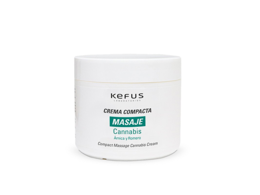 Crema compacta para masaje profesional Kefus formulada con activos naturales de Cannabis, Árnica y Romero. Su fórmula concentrada proporciona un efecto calmante y tonificante.